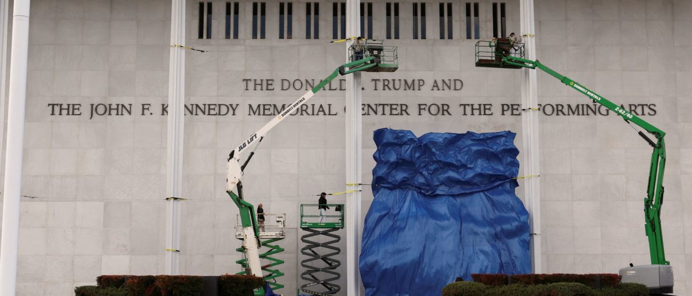 Workers stand on lifts in front of the newly added lettering for President Donald Trump’s name at the facade of the John F. Kennedy Center for the Performing Arts, a day after its board announced it would rename the institution in Washington, Dec. 19, 2025.