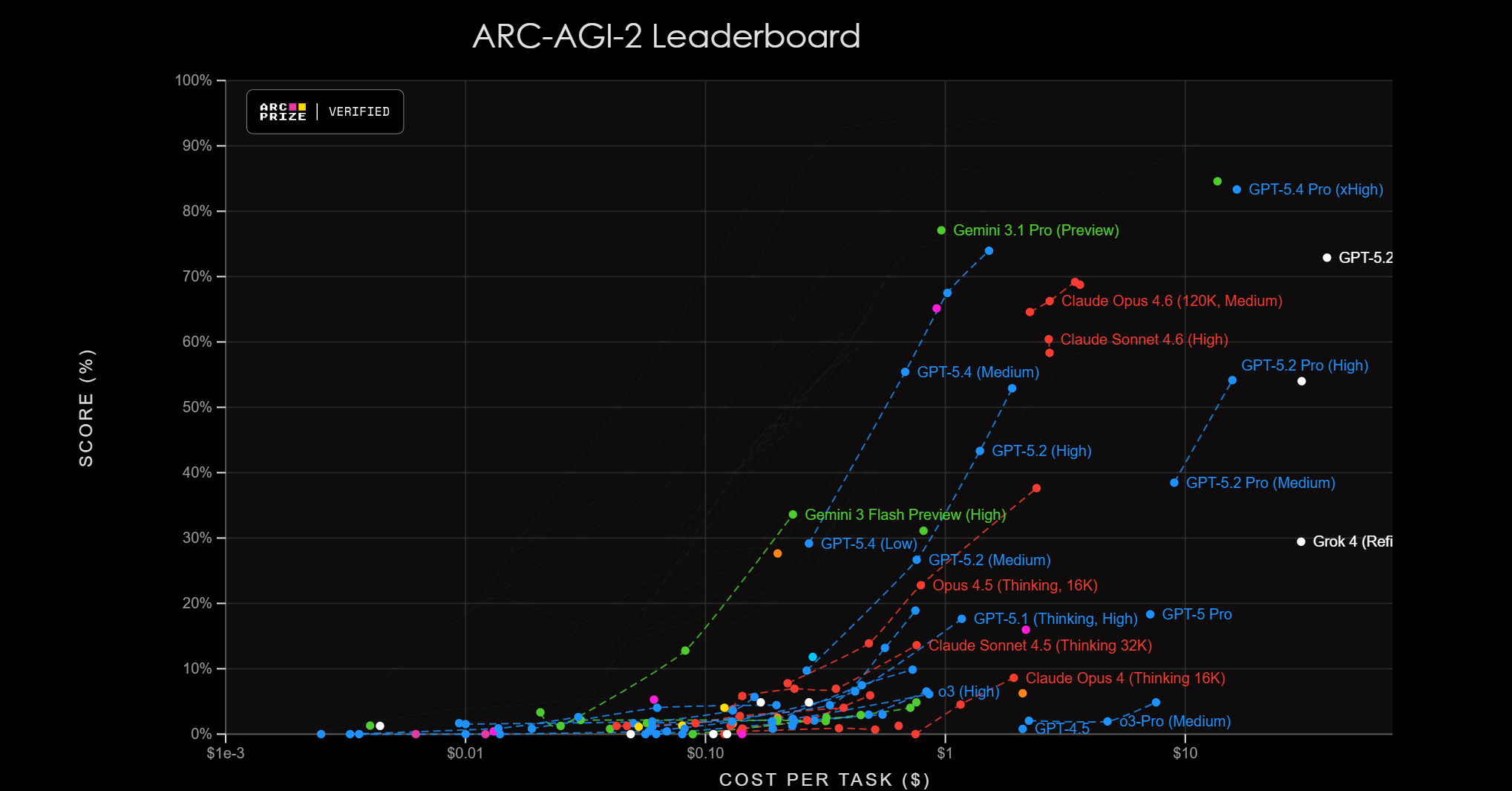 Gemini 3.1 Pro more than doubled its predecessor’s score on ARC-AGI-2 – a benchmark that tests a model’s ability to solve novel, pattern-based problems with minimal prior examples – rising from about 31% to roughly 77%.