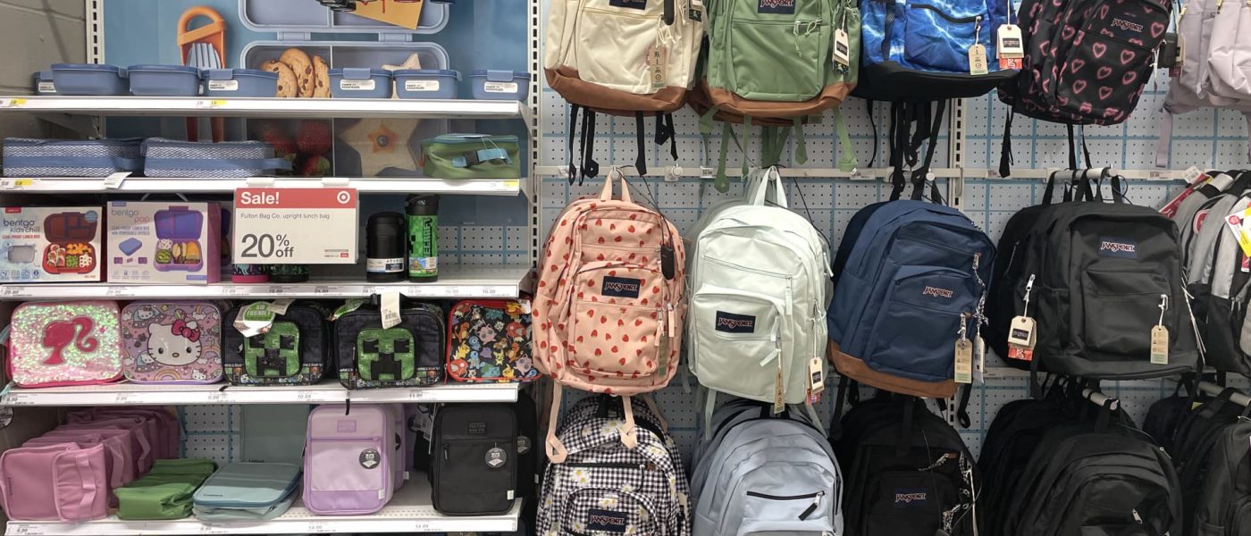 A variety of school supplies, including lunch boxes and backpacks in different colors and patterns, are on display for the upcoming school year.
