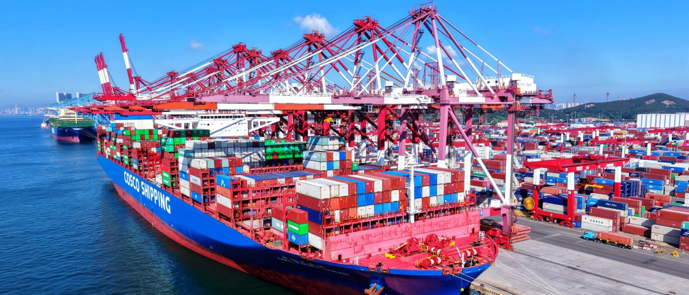 A cargo ship is loading and unloading foreign trade containers at Qingdao Port in Qingdao City, Shandong Province, China on July 28, 2025.