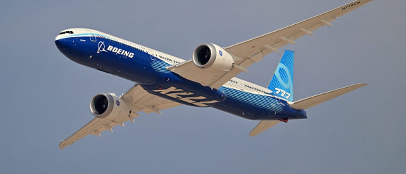 A Boeing 777-9 prepares to land at Al-Maktoum International Airport during the Dubai Airshow 2025 in Dubai on November 17, 2025.