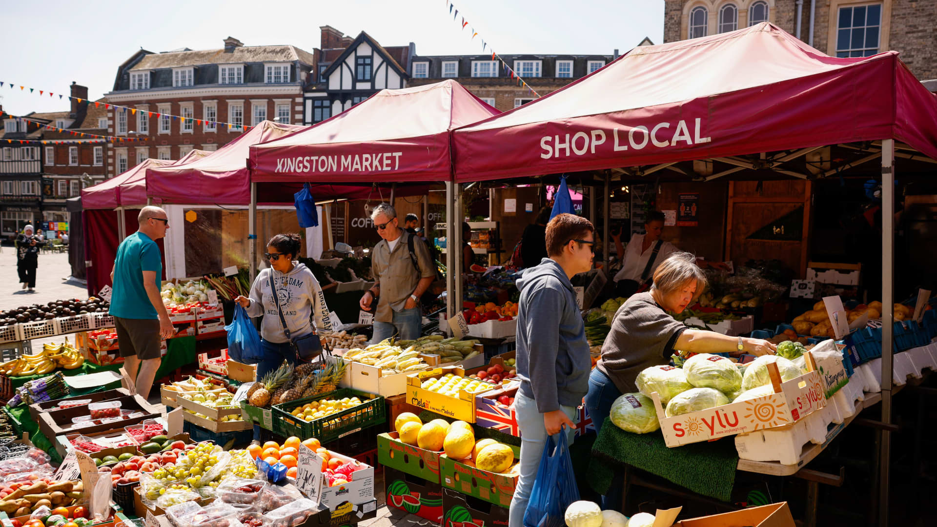 A shopper selects fresh produce from a market stall in the Kingston district of London, UK, on Monday, May 20, 2024.