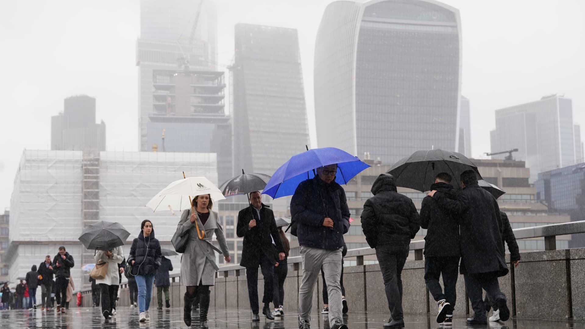 People walk in the rain over the London Bridge in central London on March 12, 2024.