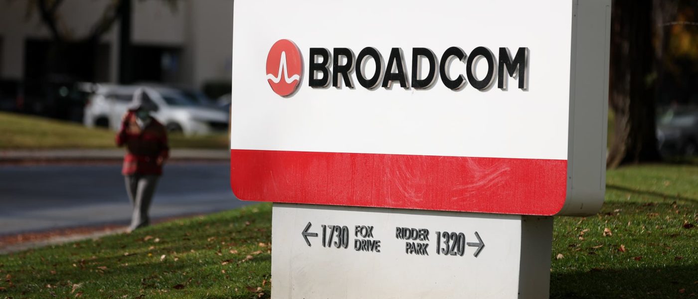 A sign is posted in front of a Broadcom office in San Jose, California, on Dec. 12, 2024.