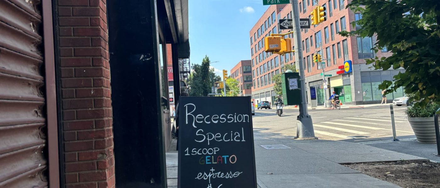 A sign outside Brooklyn coffee shop Clever Blend offers a $6 gelato and espresso “recession special.”