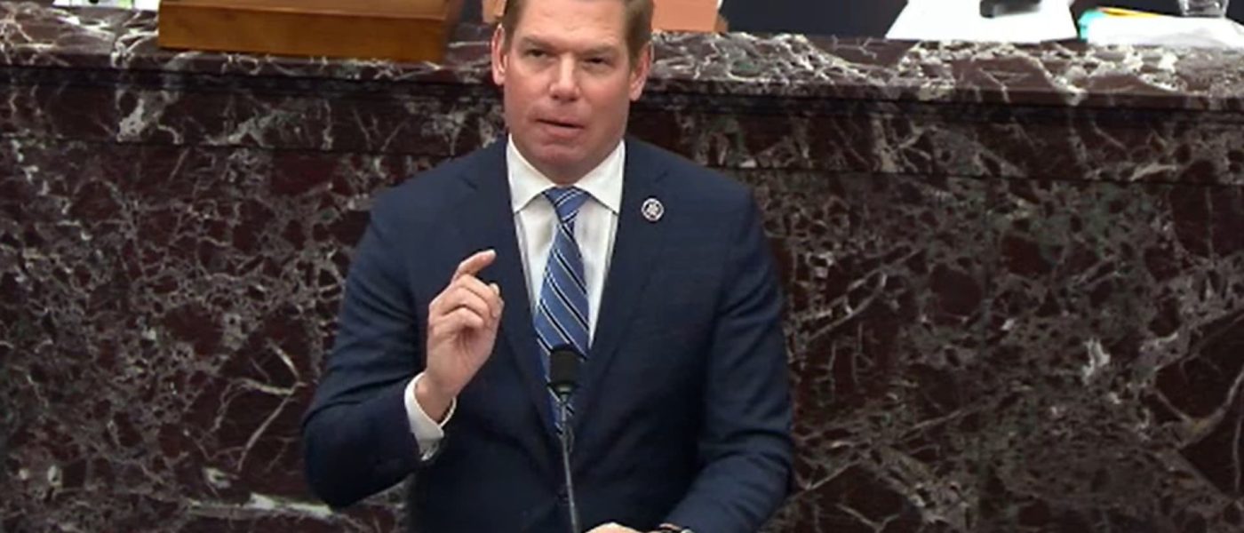 In this screenshot taken from a congress.gov webcast, Impeachment Manager Rep. Eric Swalwell, D-Calif., speaks on the second day of President Donald Trump’s second impeachment trial at the Capitol in Washington, Feb. 10, 2021.