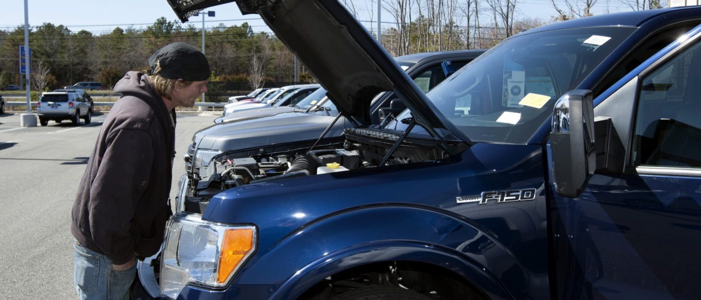 A customer looks at a Ford F-150 pickup truck at a CarMax dealership in Brandywine, Md.