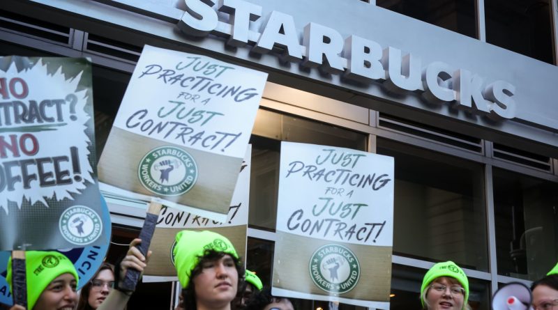 Read MoreStarbucks workers and supporters practice picket outside a Starbucks location in New York, US, on Wednesday, Oct. 1, 2025. Michael