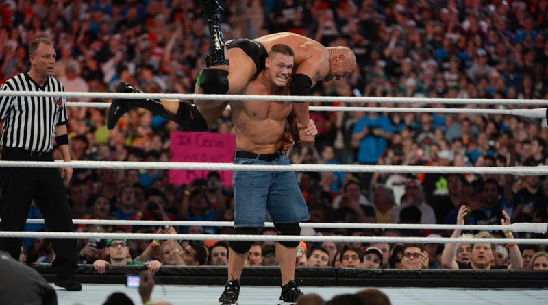 Read MoreDwayne ”The Rock” Johnson and John Cena in action during WrestleMania XXVIII at Sun Life Stadium on April 1, 2012