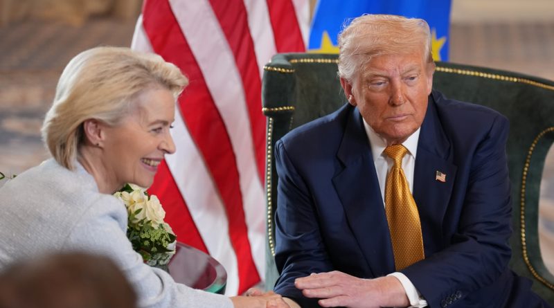 Read MoreU.S. President Donald Trump and President of the European Commission Ursula von der Leyen shake hands as they announce a