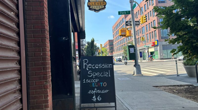 Read MoreA sign outside Brooklyn coffee shop Clever Blend offers a $6 gelato and espresso “recession special.” Lisa Kailai Han |