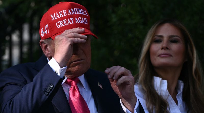 Read MoreFirst Lady Melania Trump (C) looks on as U.S. President Donald Trump as he dons his MAGA hat before greeting