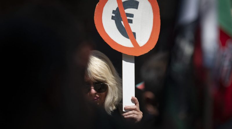 Read MoreA person beats a drum with the euro logo crossed out in red on the drumhead during a demonstration against