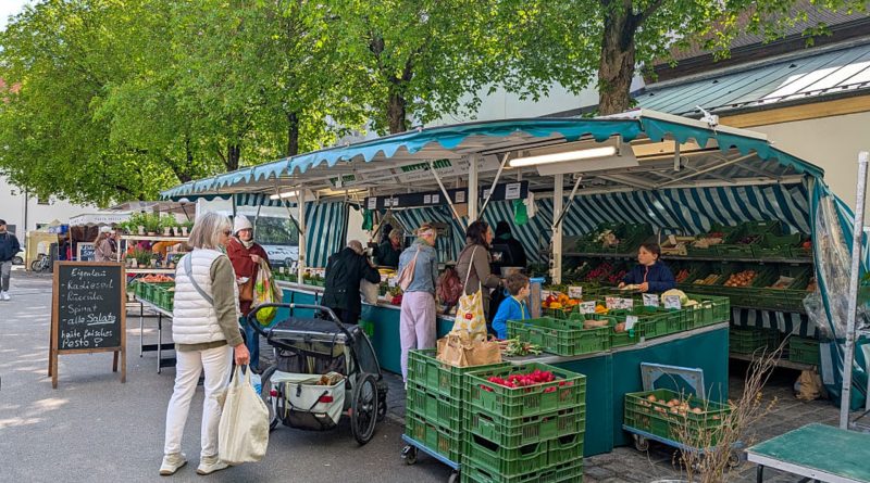 Read MoreShoppers buy fresh vegetables, fruit, and herbs at an outdoor produce market under green-striped canopies in Regensburg, Upper Palatinate, Bavaria,