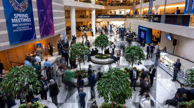 Guests and attendeess mingle and walk through the atrium during the IMF/World Bank Group Spring Meetings at the IMF headquarters