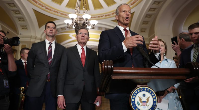 Read MoreSenate Majority Leader John Thune (R-SD) speaks to reporters at Capitol Hill on June 24, 2025 in Washington. Tasos Katopodis