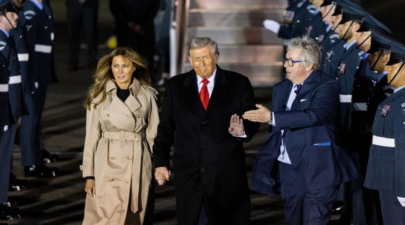 Read MoreViscount Hood, Lord-in-Waiting, right, greets U.S. President Donald Trump, center, and First Lady Melania Trump as they disembark from Air