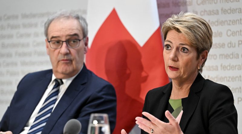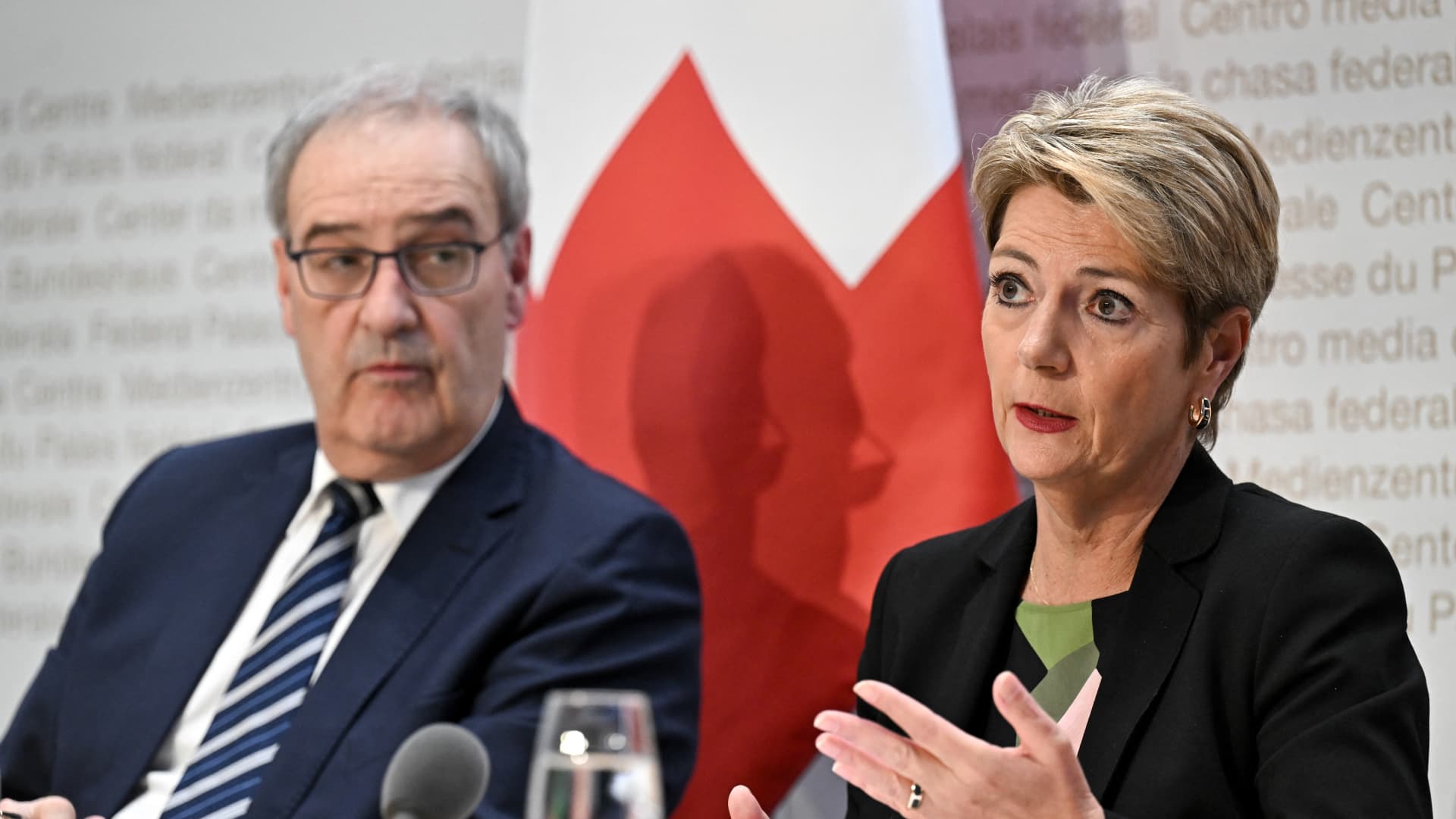 Read MoreSwiss President Karin Keller-Sutter (R) and Swiss Economy Minister Guy Parmelin address a press conference on US tariffs in Bern