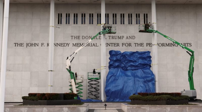 Read MoreWorkers stand on lifts in front of the newly added lettering for President Donald Trump’s name at the facade of