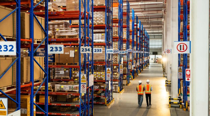 Read MoreA large industrial warehouse features rows of shelves stacked with packages, while two workers in safety gear are walking and