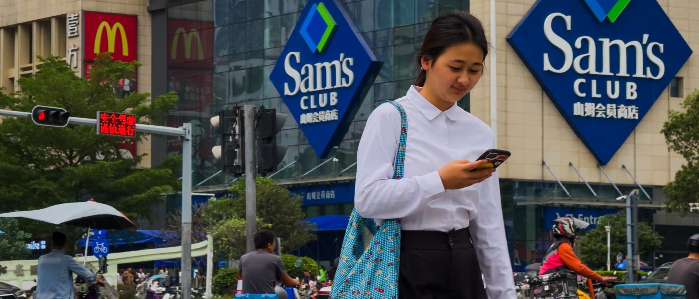SHENZHEN, CHINA – APRIL 12: A woman checks her smartphone while walking past a busy intersection in front of a Sam’s Club membership store and a McDonald’s restaurant on April 12, 2025 in Shenzhen, China.