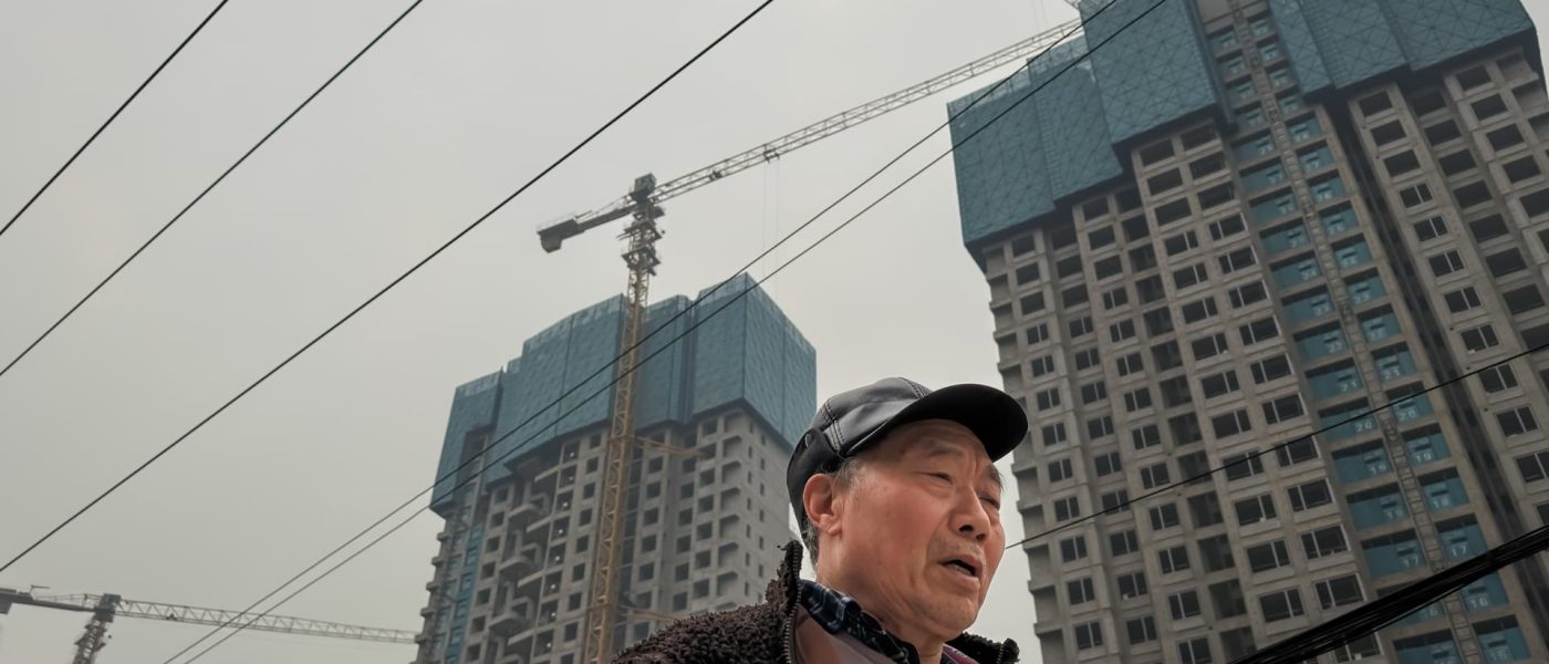 CHONGQING, CHINA – JANUARY 16: An elderly man walks along a street with high-rise residential buildings under construction in the background, where tower cranes and overhead power lines are visible on January 16, 2026, in Chongqing, China.