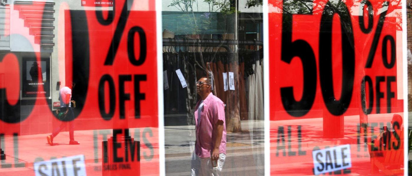 Visitors are caught in the reflection of a store offering 50% off on all items on the Third Street Promenade in Santa Monica on July 16, 2024.