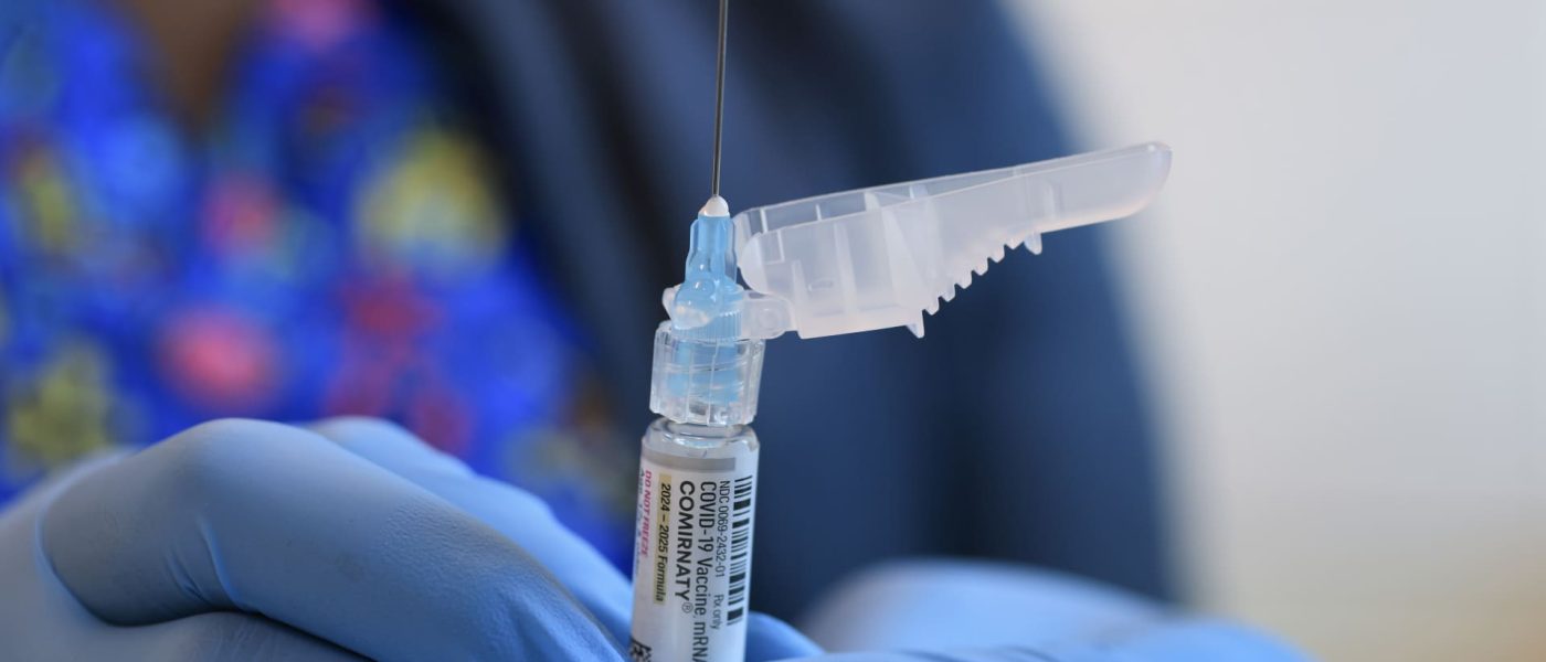 Ruth Jones, immunization nurse, holds a Pfizer-BioNTech COVID-19 vaccine (brand name: Comirnaty) at Borinquen Health Care Center in Miami, Florida, on May 29, 2025.