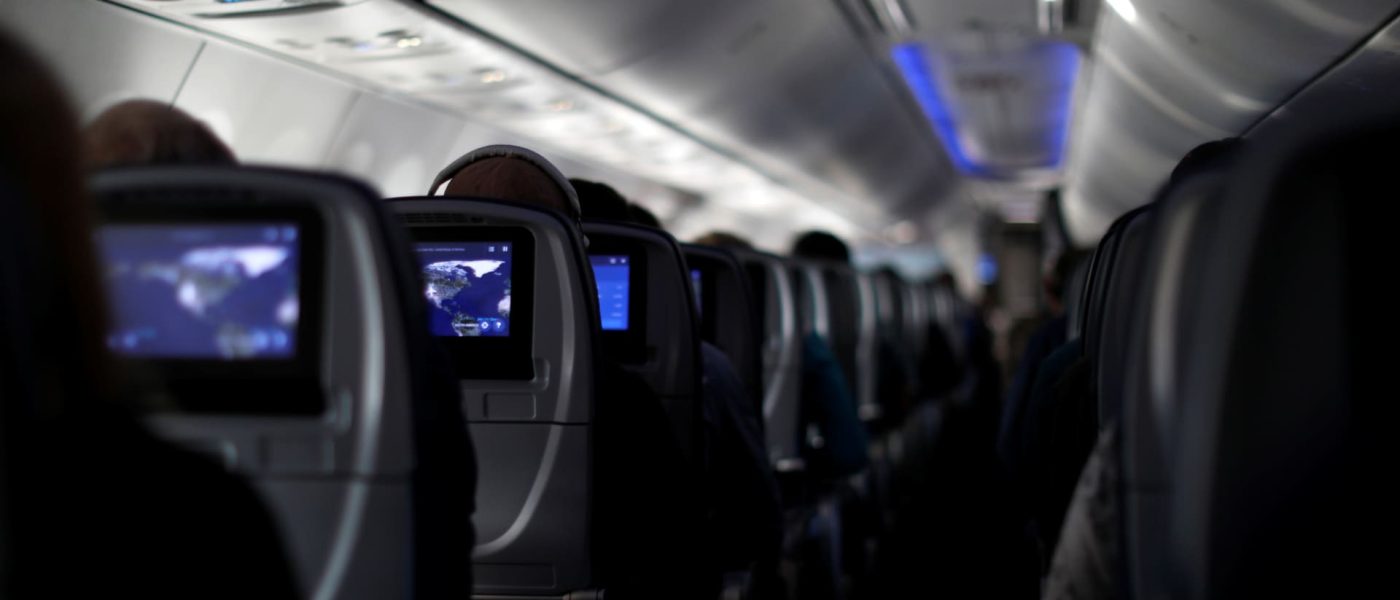 The passenger cabin on a Delta Boeing 737-900ER is shown while landing in Salt Lake City, Utah.