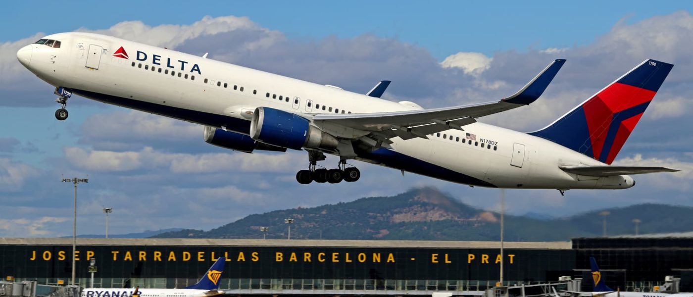A Boeing 767-332(ER) from Delta Air Lines takes off from Barcelona El Prat Airport in Barcelona on Oct. 8, 2024.