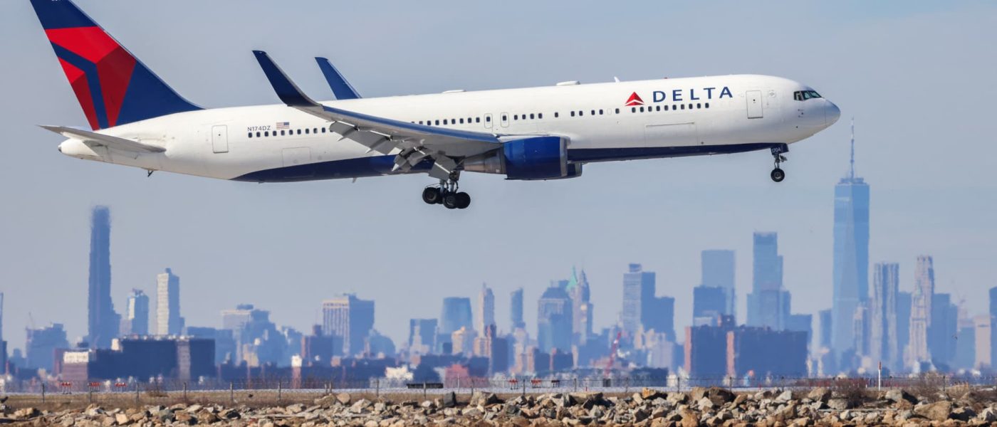 A Boeing 767 passenger aircraft of Delta Air Lines arrives from Dublin at JFK International Airport in New York as the Manhattan skyline looms in the background on Feb. 7, 2024.