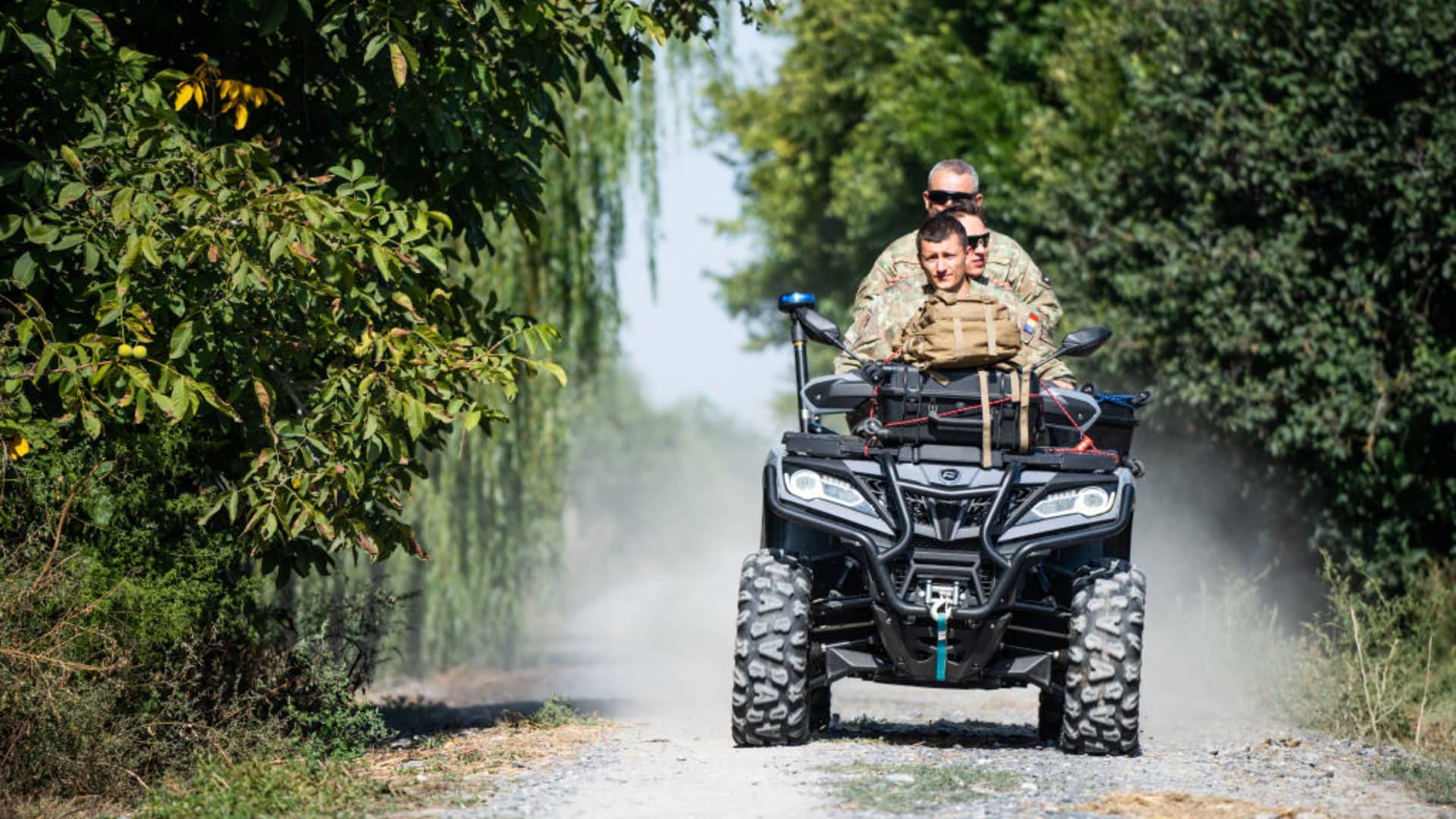 Romanian soldiers ride an ATV down a street in the village of Plauru, Danube Delta, 300kms east of Bucharest, Romania, on September 12, 2023.