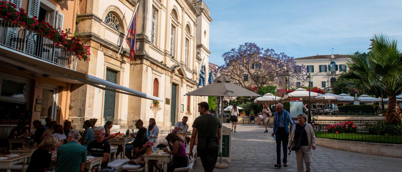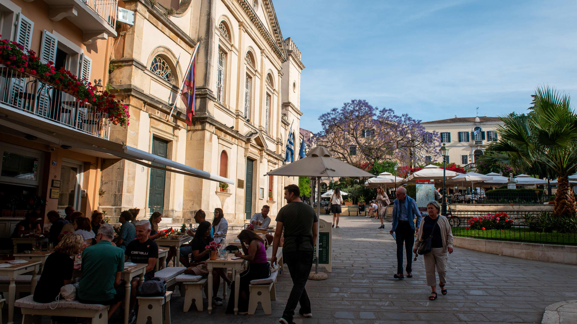 General view of the center of Corfu with a little restaurant in Old Town in Corfu, Greece, in May 2024.