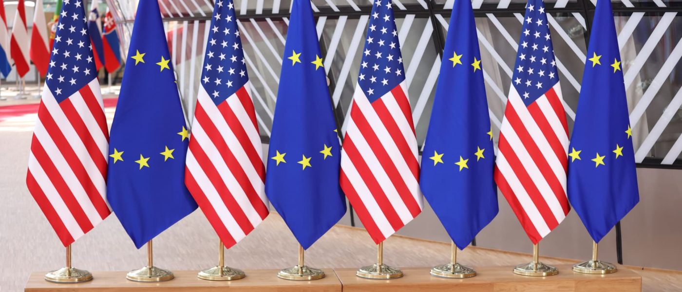 BRUSSELS, BELGIUM – JUNE 15: Flags are places at EU Council Building prior to the meeting of U.S President Joe Biden, European Council President Charles Michel and President of the European Commission, Ursula von der Leyen for US-EU Summit in Brussels, Belgium on June 15, 2021. (Photo by Dursun Aydemir/Anadolu Agency via Getty Images)