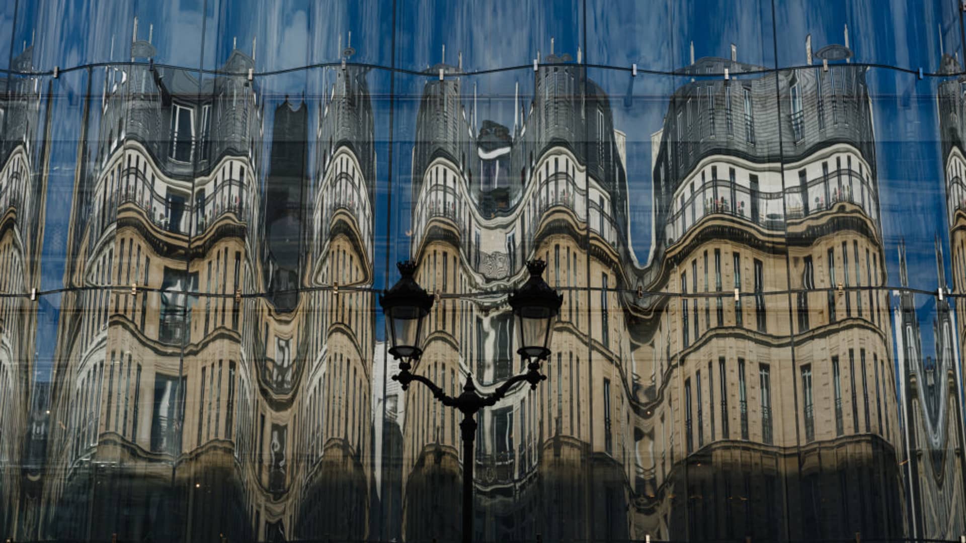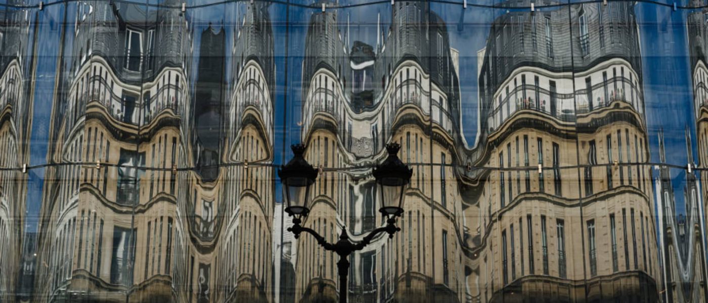Haussmann architecture buildings are reflected on the facade of Samaritaine department store in central Paris on October 10, 2023.