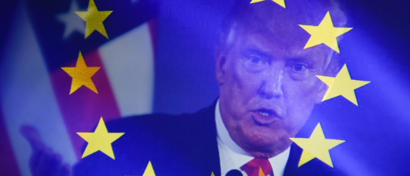 In this photo illustration, a double exposure images shows U.S. President Donald Trump against the EU flag.
