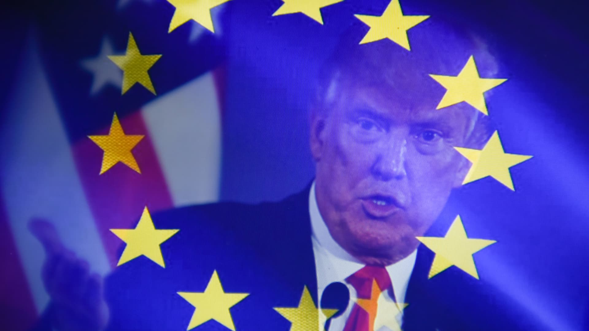 In this photo illustration, a double exposure images shows U.S. President Donald Trump against the EU flag.