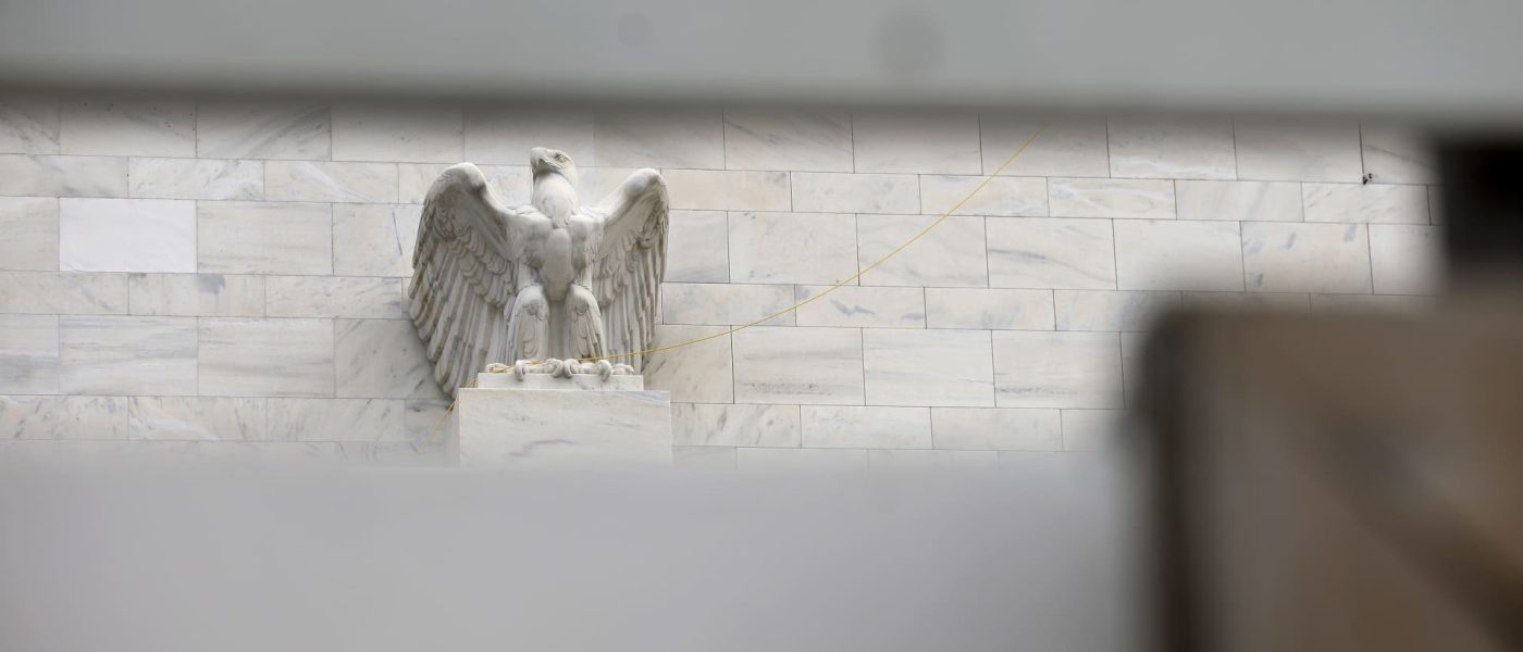 An eagle is seen framed though construction fence on the Marriner S. Eccles Federal Reserve Board Building, the main offices of the Board of Governors of the Federal Reserve System on September 16, 2025 in Washington, DC, U.S.