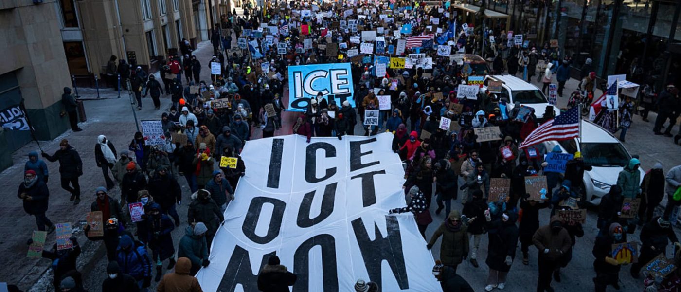 Protestors march during a “Nationwide Shutdown” demonstration against ICE enforcement on Jan. 30, 2026 in Minneapolis, Minnesota.