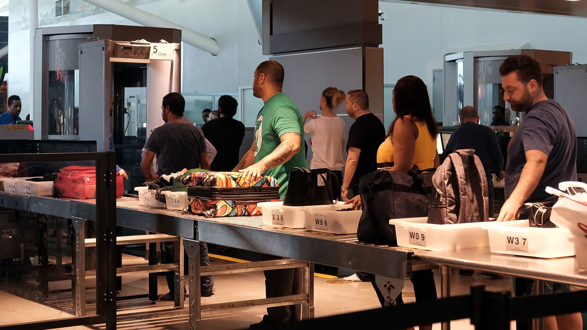 People wait in a security line operated by the Transportation Security Administration (TSA) at John F. Kennedy (JFK) Airport on May 24, 2016 in New York, New York.