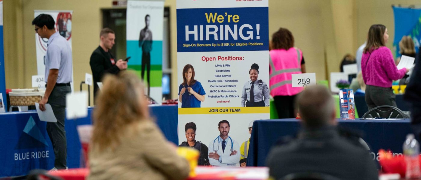 A “We’re Hiring” sign at a NC Department of Adult Correction booth at a job and resource fair hosted by the Asheville Area Chamber of Commerce in partnership with NCWorks in Fletcher, North Carolina, US, on Wednesday, April 9, 2025.