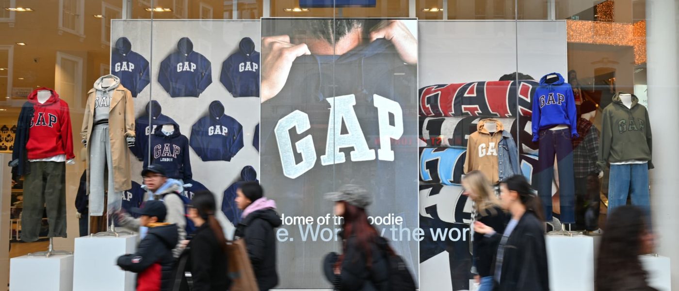 Shoppers walk past a GAP fashion retail store on Oxford Street on October 30, 2025 in London, United Kingdom.