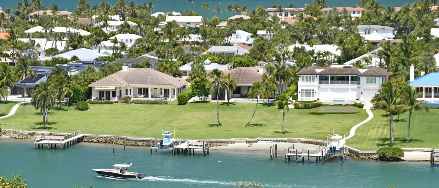 View of luxury waterfront homes and boats along the intracoastal waterway near Jupiter Inlet in Jupiter, Florida in Palm Beach County