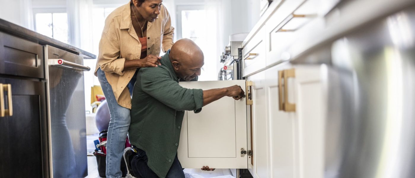 Senior couple repairing kitchen cabinet at home