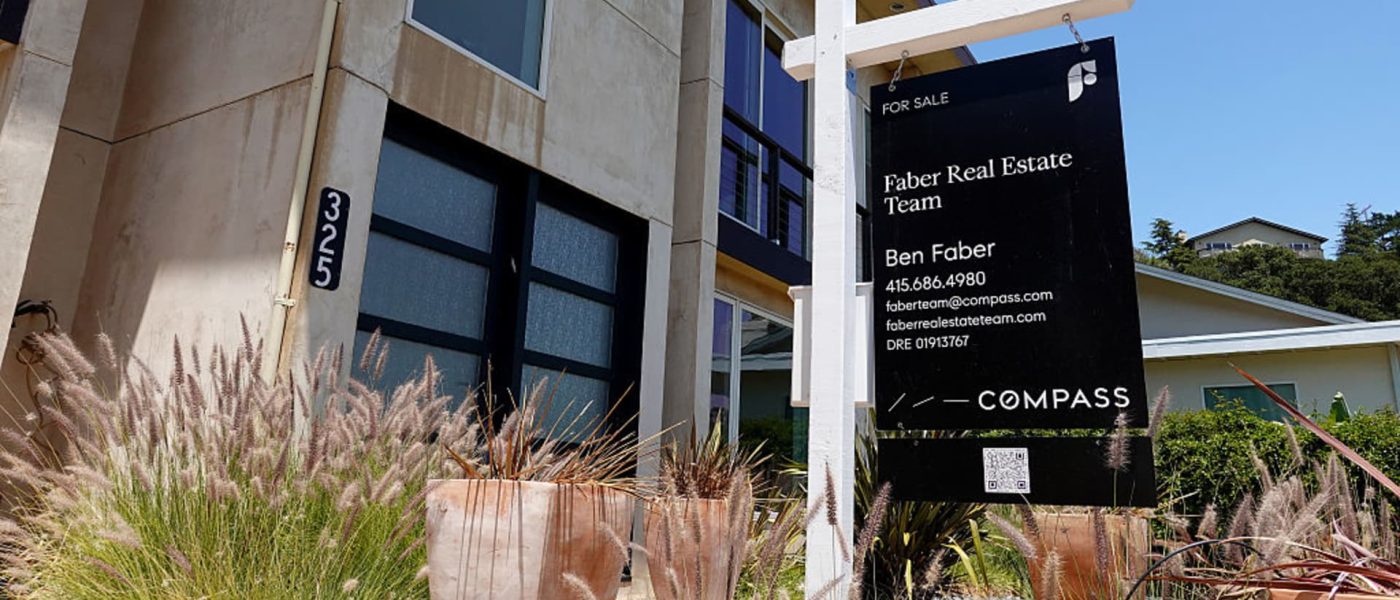 A Compass Realty sign is posted in front of a home for sale on June 23, 2025 in Greenbrae, California.