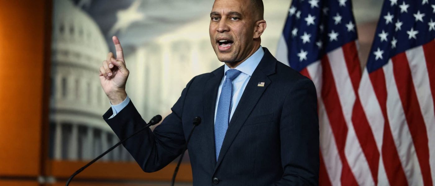 U.S. House Minority Leader Hakeem Jeffries (D-NY) raises a finger as he speaks during a press conference, more than a month into the longest U.S. government shutdown in Washington, D.C., U.S., November 10, 2025.