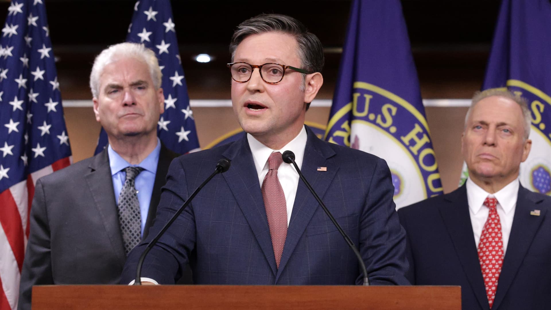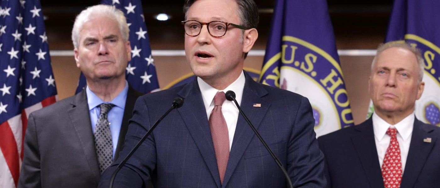 U.S. Speaker of the House Rep. Mike Johnson (R-LA) speaks as (L-R) House Majority Whip Rep. Tom Emmer (R-MN) and House Majority Leader Rep. Steve Scalise (R-LA) listen during a news conference at the U.S. Capitol on July 22, 2025 in Washington, DC.