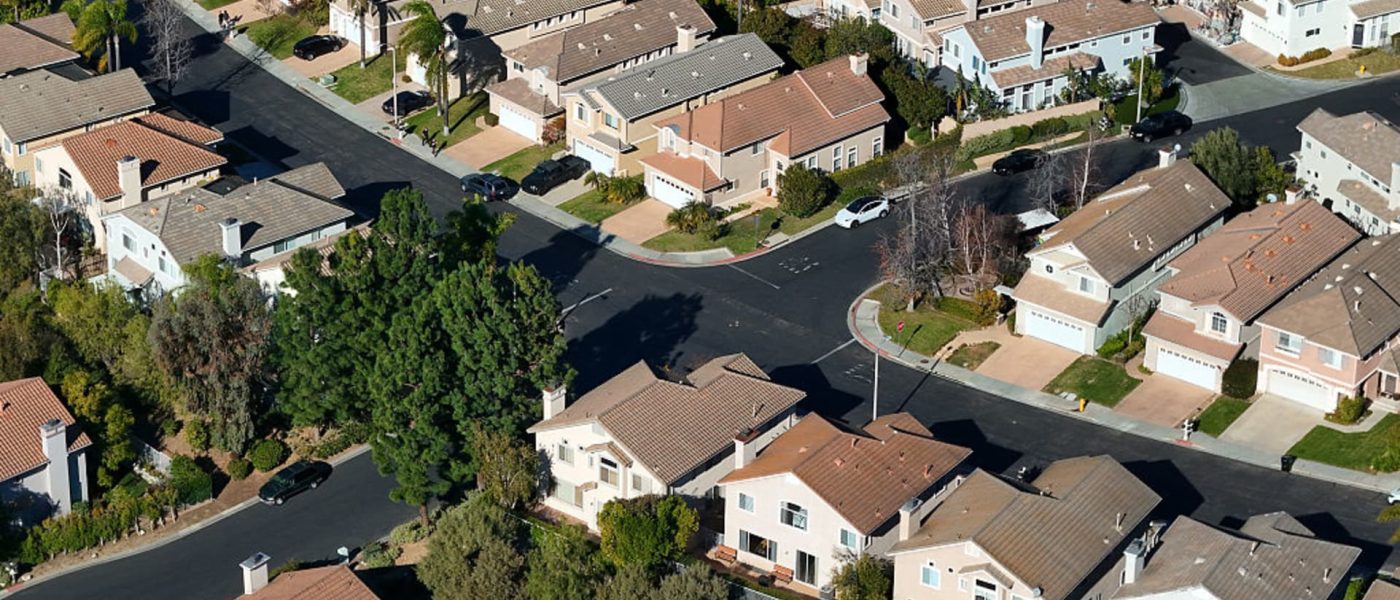 In an aerial view, two-story single family homes line the streets on Jan. 14, 2026 in Thousand Oaks, California.