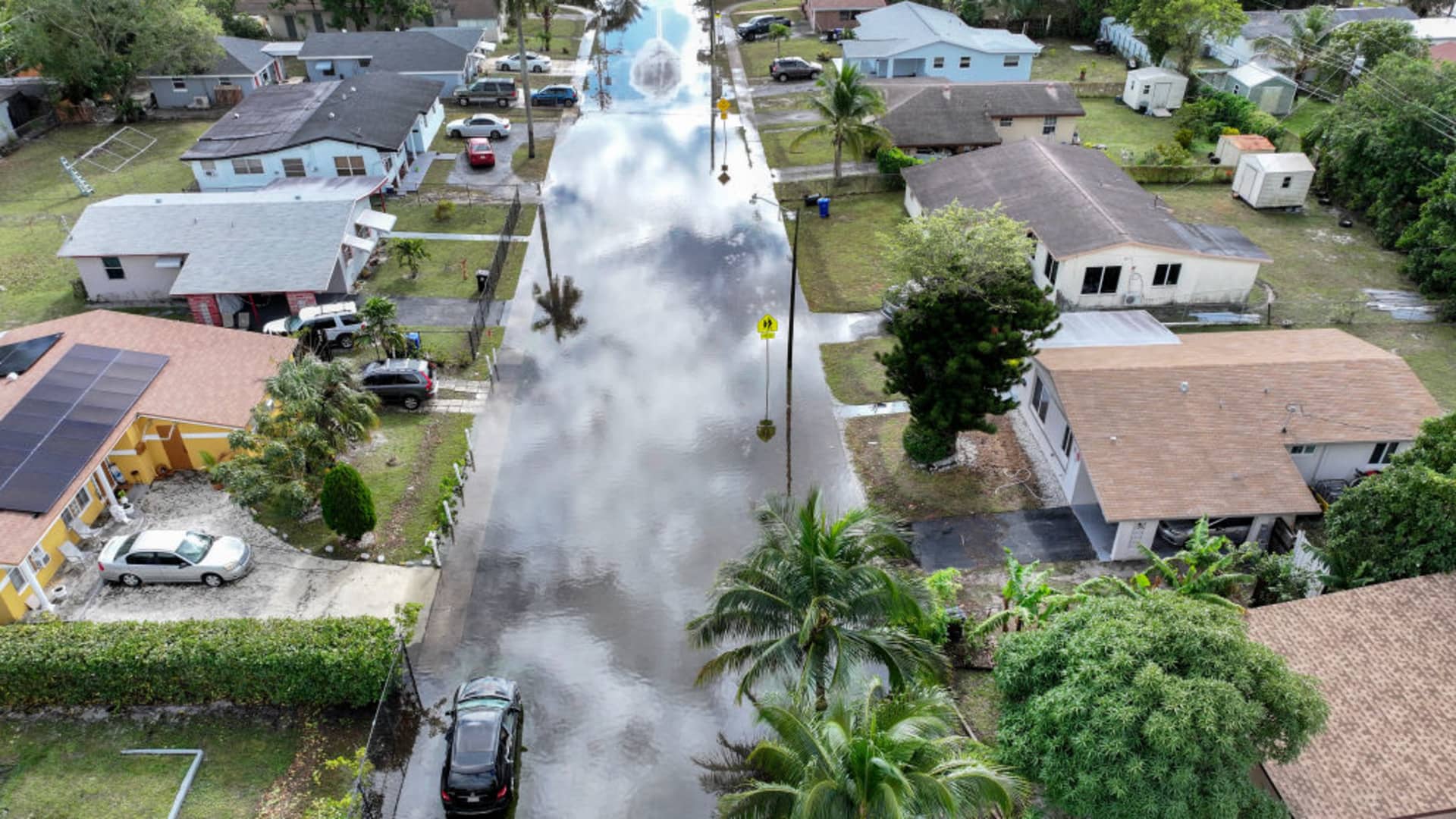 An aerial view of a flooded residential neighborhood street after localized heavy rain on December 18, 2024 in Fort Lauderdale, Florida.
