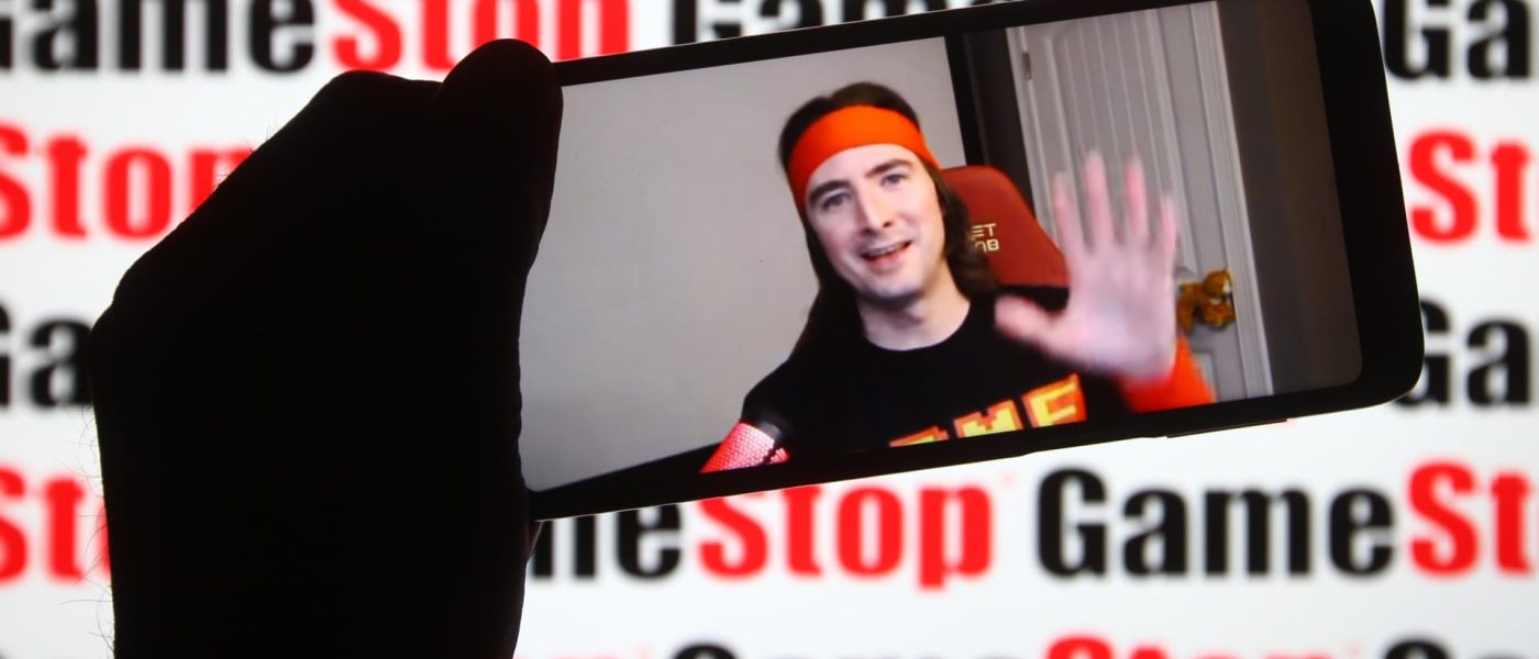 Keith Gill, known on Reddit under the pseudonym DeepF——-Value and as Roaring Kitty, is seen on a fragment of a youtube video displayed on a smartphone screen in front of GameStop logo.